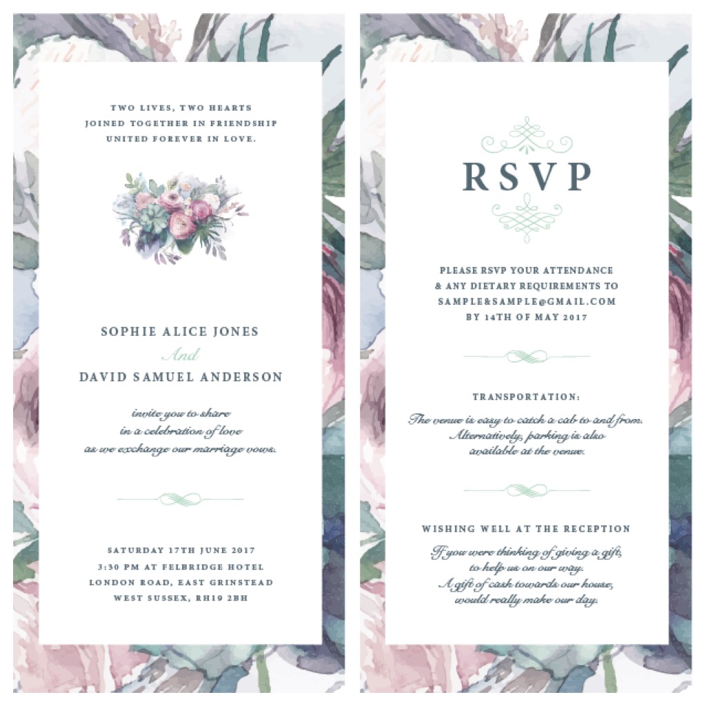 Choose from a range of layouts and designs, we will design you a personalised invite and RSVP wedding invitation. Layouts range from simple to floral and much more, add this to your quote or request more information now. Prices are excluding print and postage costs and are for design and layout only. We can supply an additional quote to look after all printing costs too if required.
